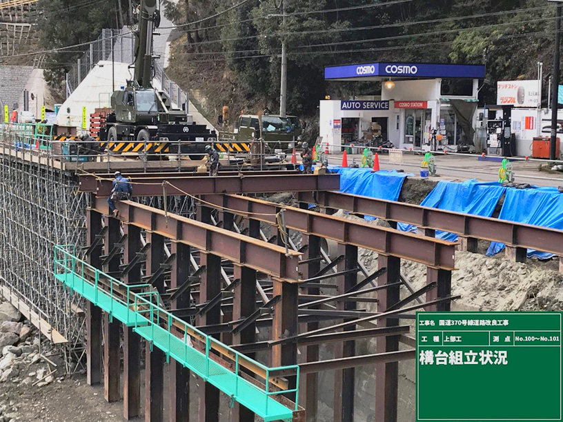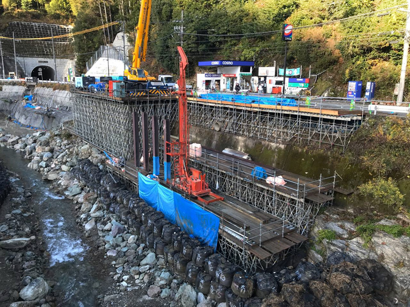 道路改良に伴う桟道橋を施工しています。