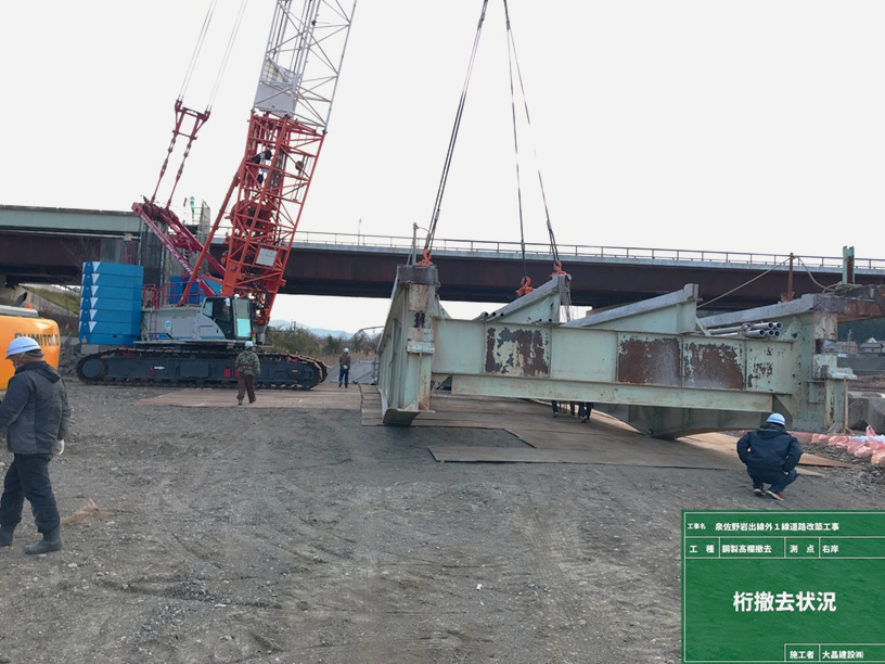 旧岩出橋の撤去工事で200tのクローラクレーンで吊上げて撤去しています。
