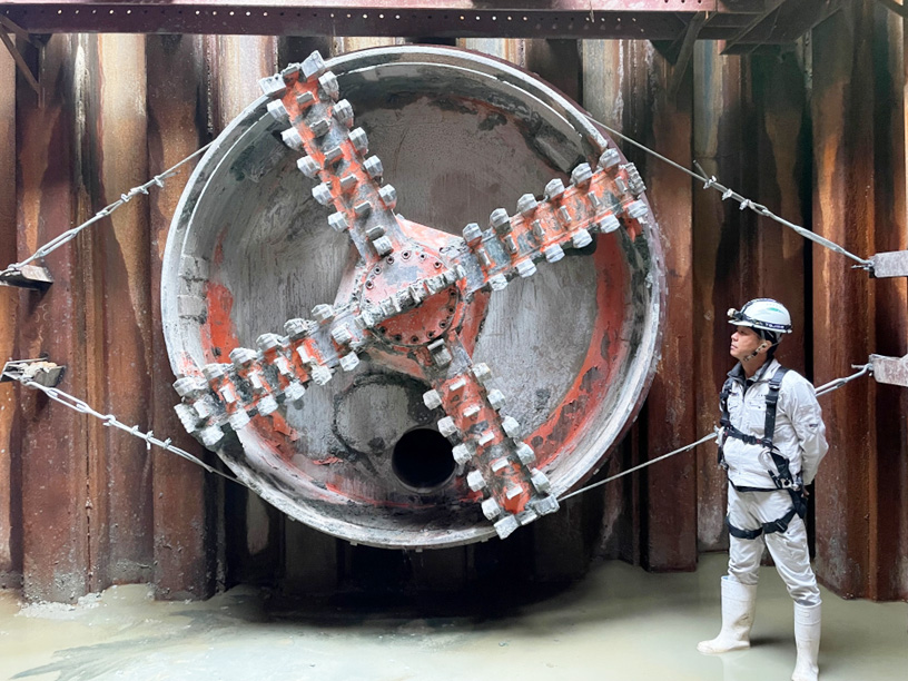 地中7~10m下をマシンで掘削しΦ2.2mの管を挿入していく工事で、マシン到達の写真です。