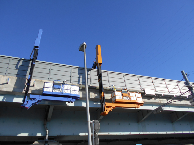 橋梁点検車を使用し、橋梁部における情報管路の設置作業を安全に配慮しながら進めました。