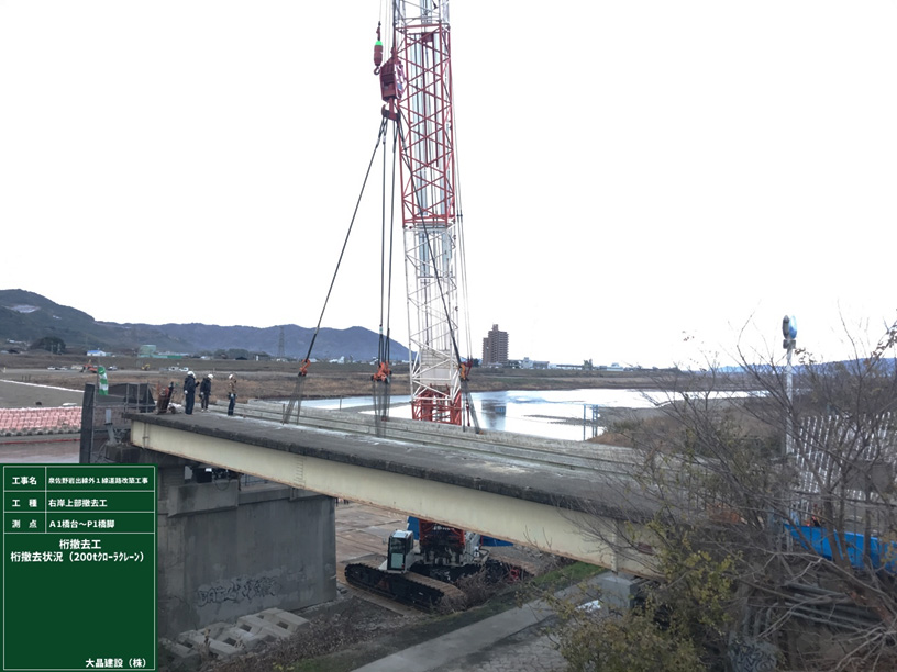 旧岩出橋の撤去工事で200tのクローラクレーンで吊上げて撤去しています。
