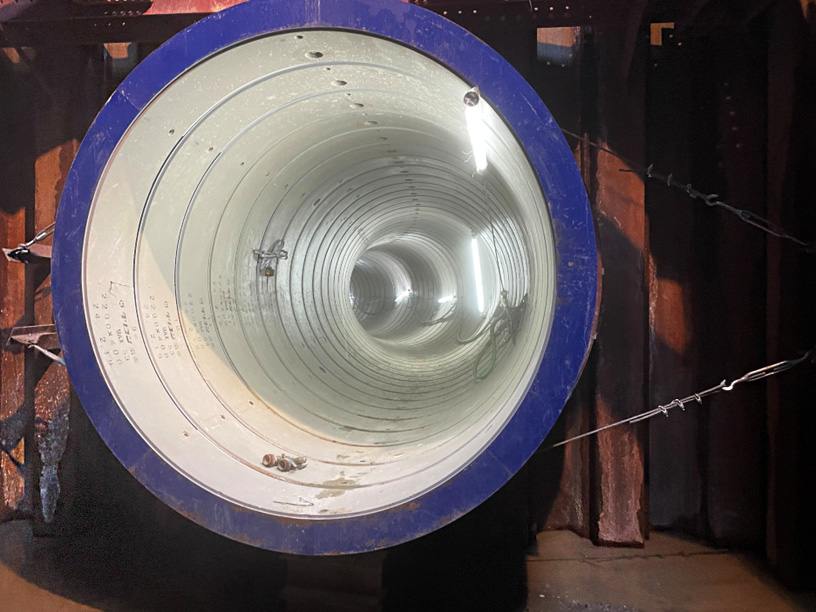 地中7~10m下をマシンで掘削しΦ2.2mの管を挿入していく工事で、マシン到達の写真です。