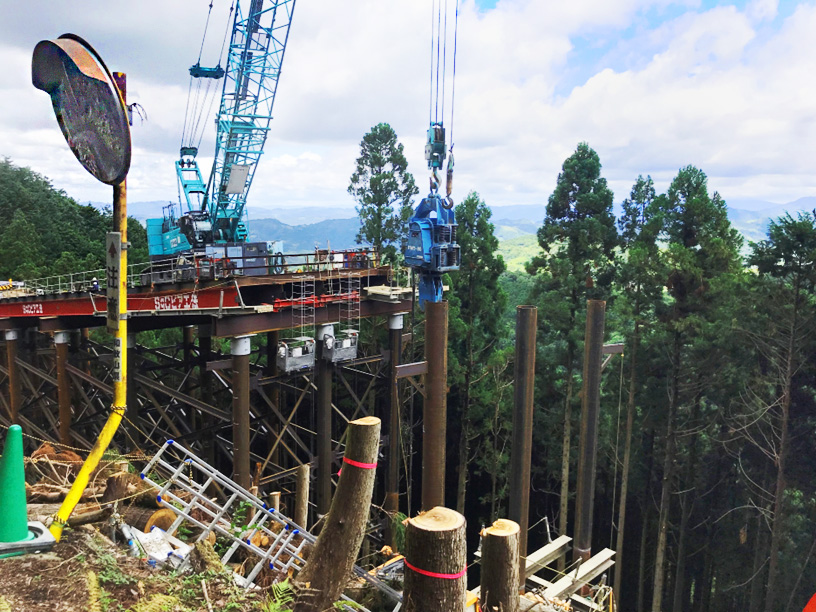 道路改良に伴う桟道橋を施工しています。