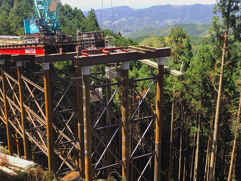 写真は、橋梁部での作業に向け、安全に施工できるよう足場を組み立てていた際の様子です。