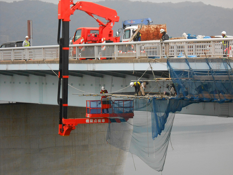 橋梁点検車を使用し、橋梁部における情報管路の設置作業を安全に配慮しながら進めました。