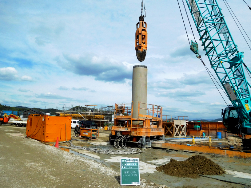 岡崎大橋の橋脚基礎部の施工で、杭打ち作業を実施していました。